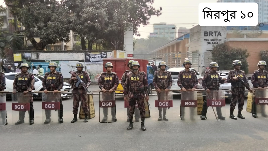Photos sent by the border force show personnel were deployed near the Mirpur-10 intersection and the Bangladesh Road Transport Authority (BRTA) premises.