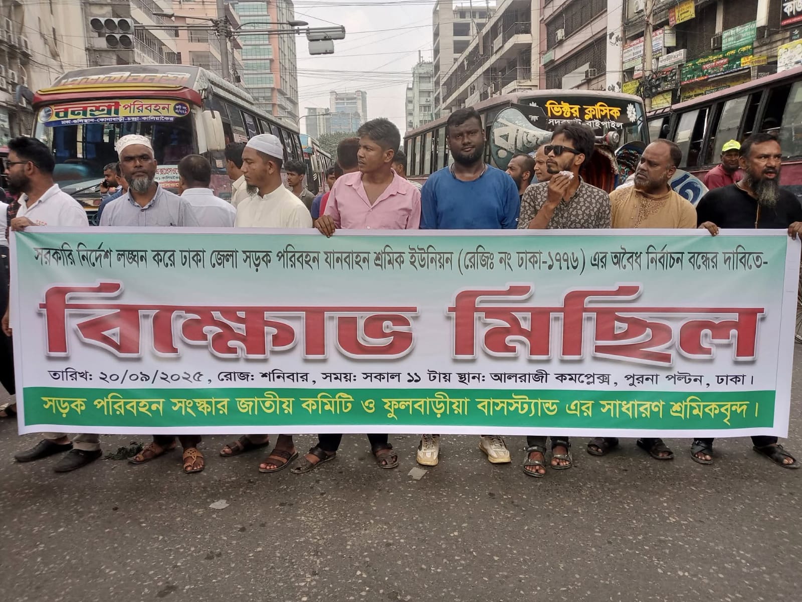 সাজু মিয়া বলেন, ঢাকা জেলা সড়ক পরিবহন যানবাহন শ্রমিক ইউনিয়ন (রেজি:নং ঢাকা-১৭৭৬ )এর কার্যনির্বাহী কমিটির নির্বাচনে মহামান্য সুপ্রীম কোর্টের হাইকোর্ট বিভাগের রীট পিটিশন নং- ৭৩৭২/২০১১ ও ৪৩১৬/২০১৪ এর রায়ের নির্দেশনা অমান্য এবং শ্রম আইন, ২০০৬ এর ৩১৭(৪) (ঘ) লঙ্ঘন করা ও শ্রম মন্ত্রণালয়ের বিভাগীয় শ্রম দপ্তর, ঢাকার গত ১৫/৯/২৫ তারিখের পত্রের নির্দেশনাকে উপেক্ষা করে ২০ সেপ্টেম্বর নির্বাচন করা হয়েছে। স্থগিতাদেশ উপেক্ষা করে নির্বাচন কমিশন নির্বাচন পরিচালনা করছে বলে তিনি অভিযোগ করেন।