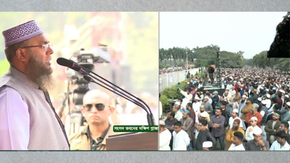 Speaking briefly before the janaza at Manik Mia Avenue, he told the crowd, “You are lakhs in number—today, you are all Hadi. He was the youngest among six siblings. And today, we are carrying his body.”