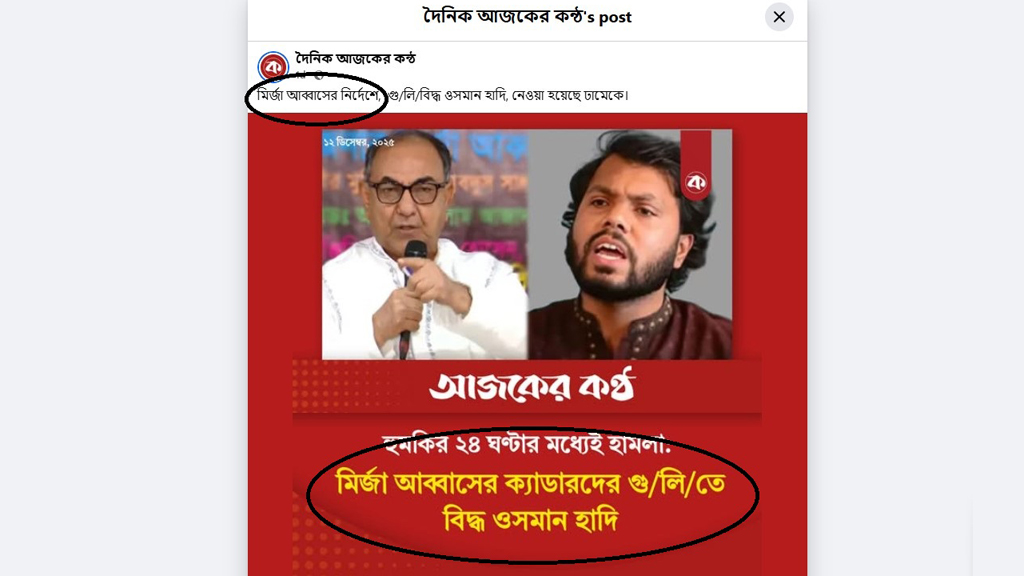 আরজিতে বলা হয়, ১২ ডিসেম্বর বিকেল ৩টা ২৫ মিনিটে দৈনিক আজকের কণ্ঠ ‘মির্জা আব্বাসের ক্যাডারদের গুলিতে বিদ্ধ ওসমান হাদি’ শিরোনামে সংবাদ প্রকাশ করে, যা সম্পূর্ণ মিথ্যা এবং বিভ্রান্তিকর।