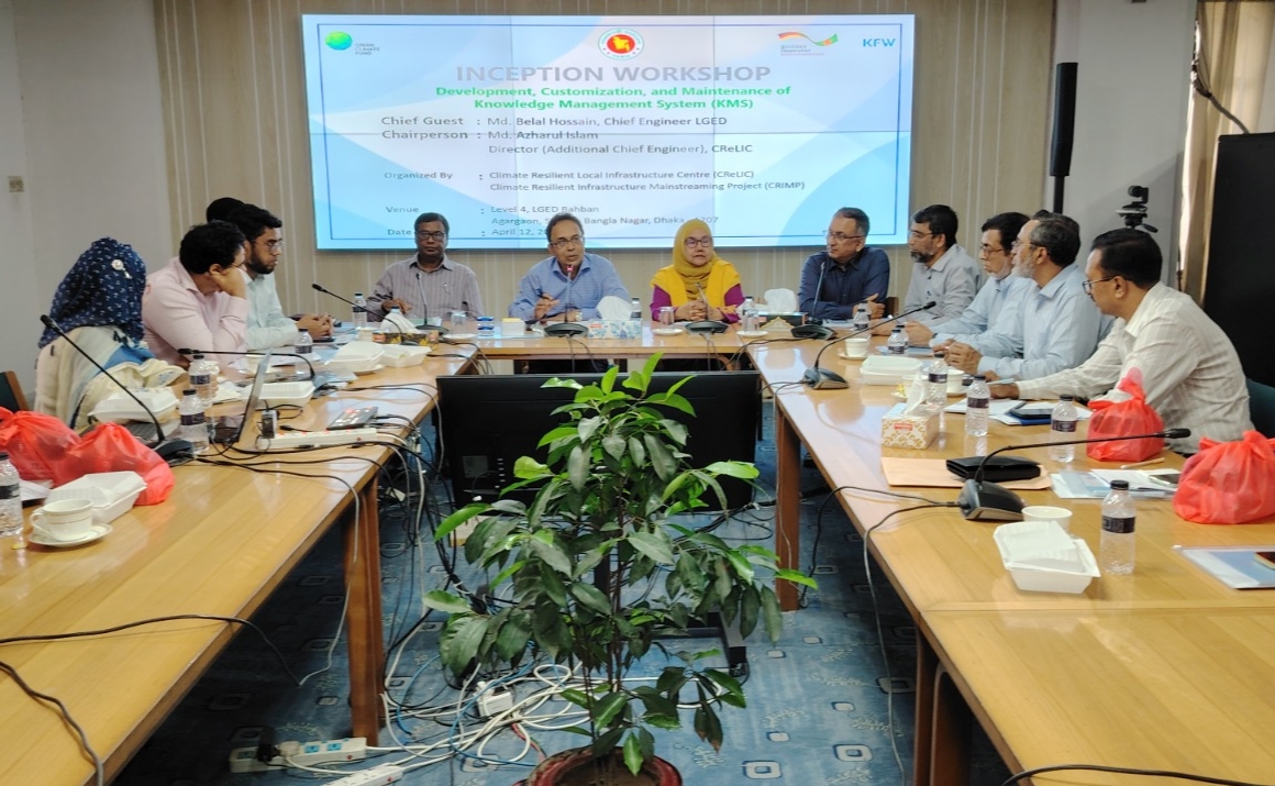 স্থানীয় সরকার প্রকৌশল অধিদপ্তর (এলজিইডি) অধীনে বাস্তবায়নাধীন ক্লাইমেট রেজিলিয়েন্ট ইনফ্রাস্ট্রাকচার মেইনস্ট্রিমিং প্রজেক্ট (ক্রিম্প) এর আওতাধীন ক্লাইমেট রেজিলিয়েন্ট লোকাল ইনফ্রাস্ট্রাকচার সেন্টার (ক্রিলিক) আয়োজিত নলেজ ম্যানেজমেন্ট সিস্টেম (কেএমএস) উন্নয়ন ও রক্ষণাবেক্ষণ বিষয়ক ইনসেপশন কর্মশালা ১২ এপ্রিল রবিবার এলজিইডি সদর দপ্তরের সেমিনার কক্ষে অনুষ্ঠিত হয়েছে।