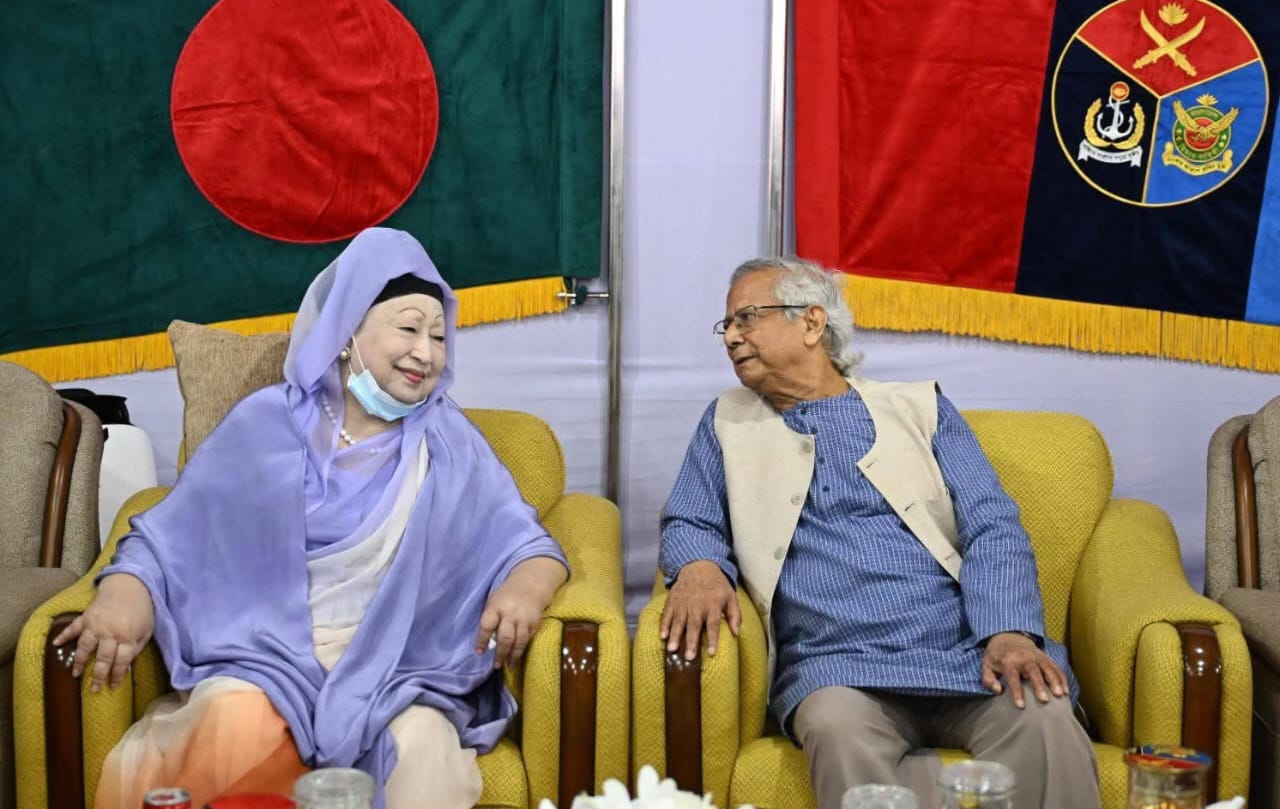 After the meeting, BNP Chairperson Khaleda Zia enjoyed the Armed Forces Day reception ceremony, sitting next to Chief Advisor Muhammad Yunus.